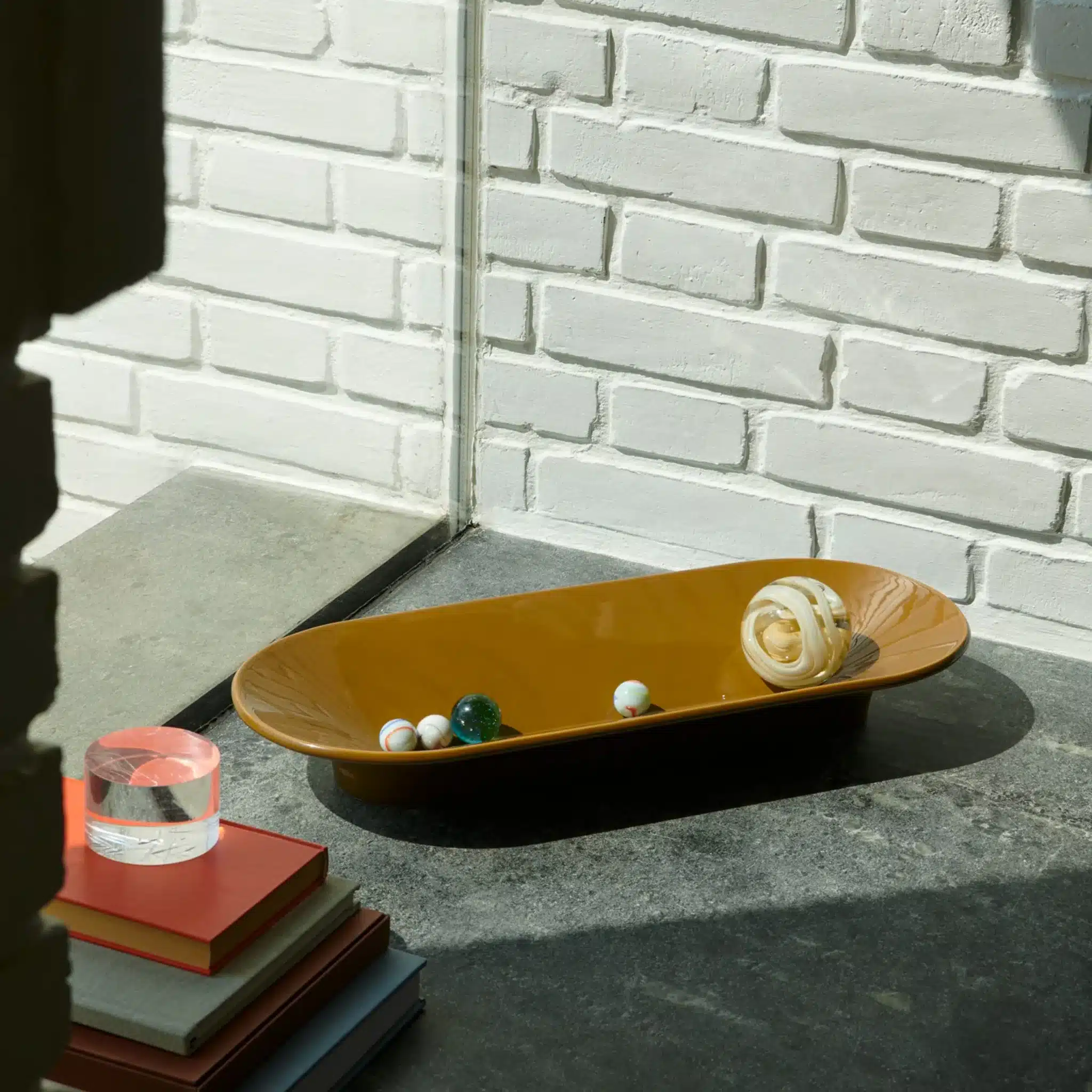 Mere Bowl is a sculptural piece that catches the eye even when not in use. The characteristic shape is simple but ingenious; a line down the center curves sideways to form the bowl. Lifted off the floor by a separate foot, it looks as if it is floating. Made of ceramic, the Mere Bowl is coated with a high-gloss glaze that enhances the shadows cast along its curve. Suitable for contact with food.